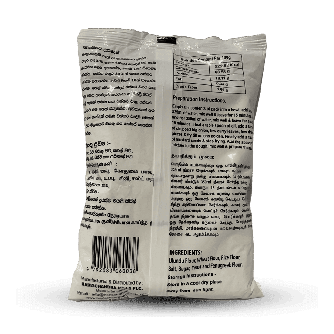 Recreate the authentic taste of classic Thosai in your own kitchen with Harischandra Thosai Mixture. Crafted from the finest ingredients under strict supervision, this mixture ensures the highest standards of hygiene and packaging. Enjoy a healthy, pure, and flavorful Thosai experience for you and your family.
